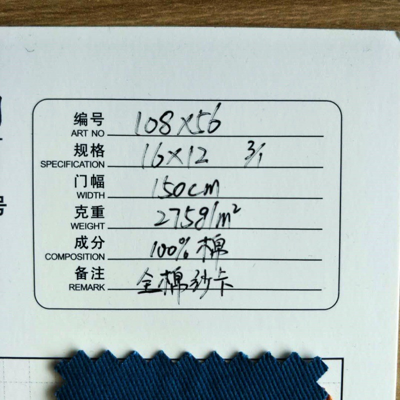 现货供应全棉10856斜纹布加厚纱卡12*16纯棉工装裤面料