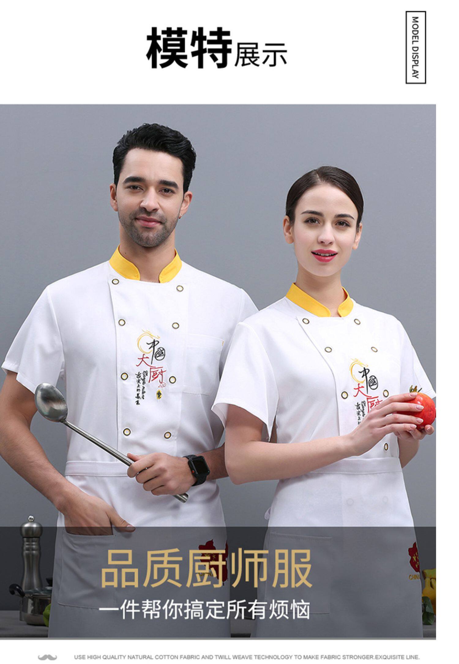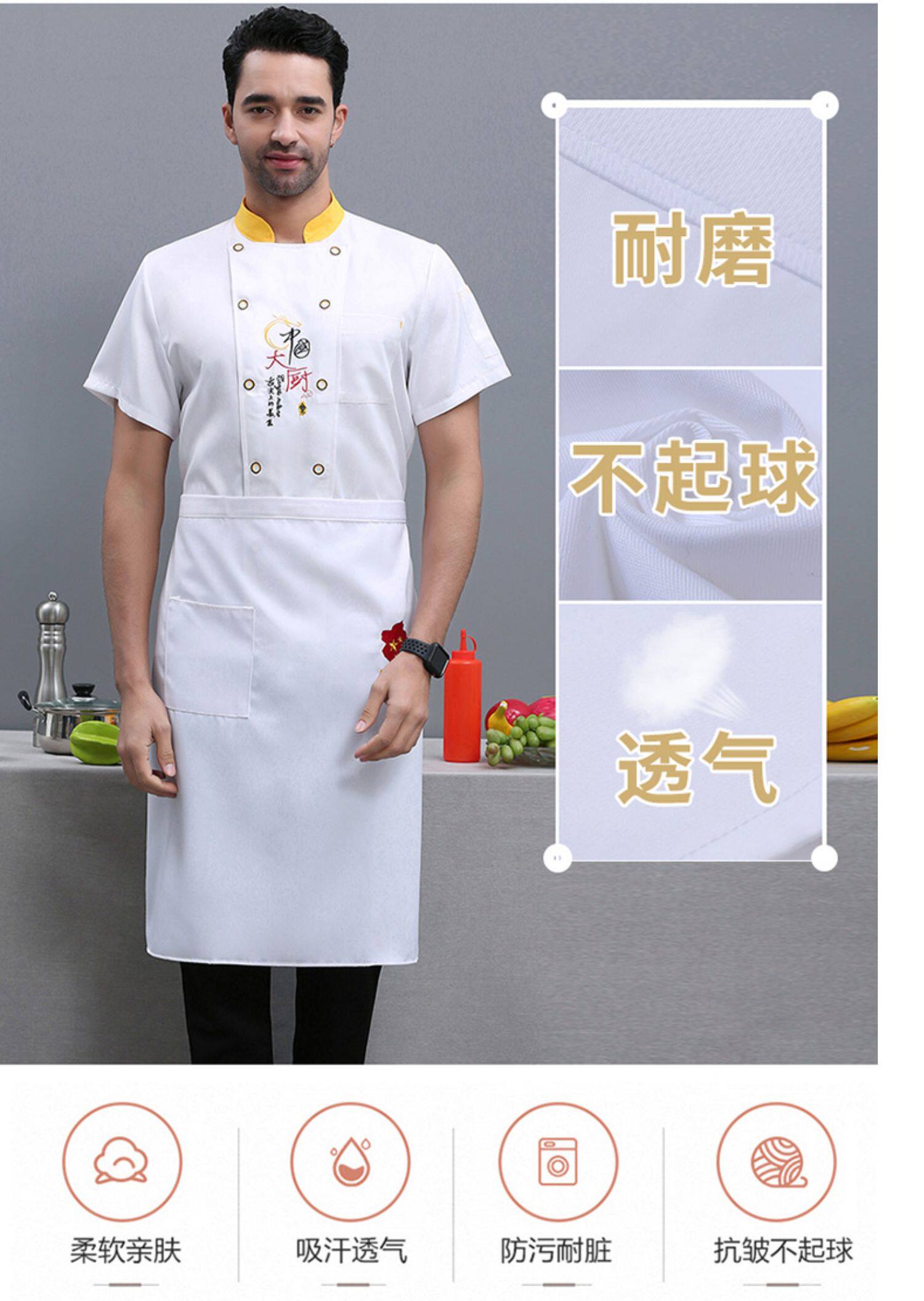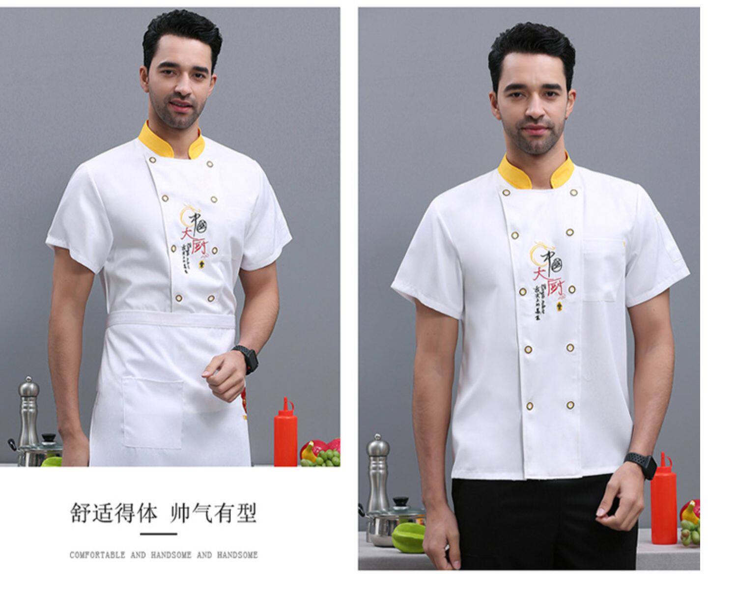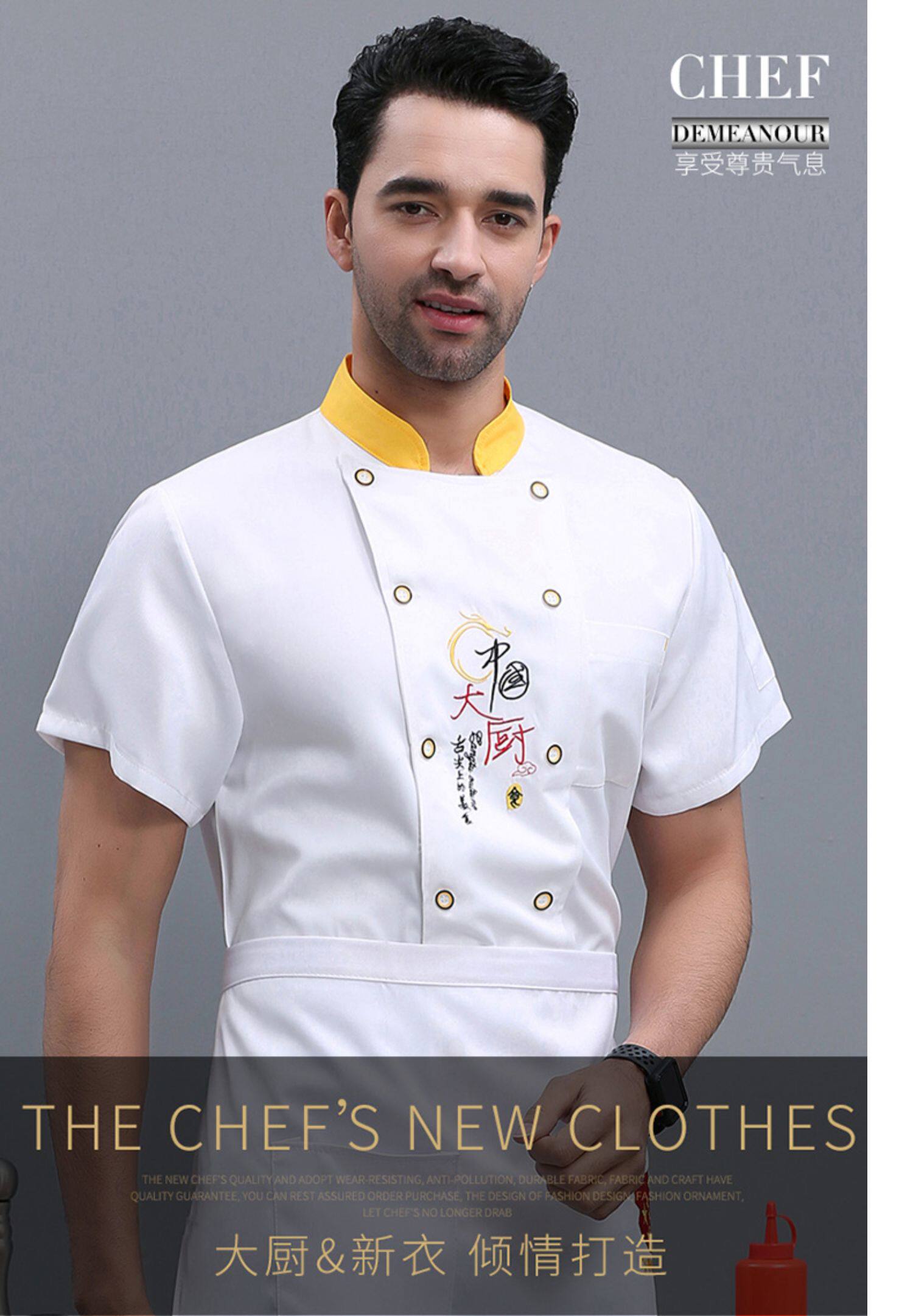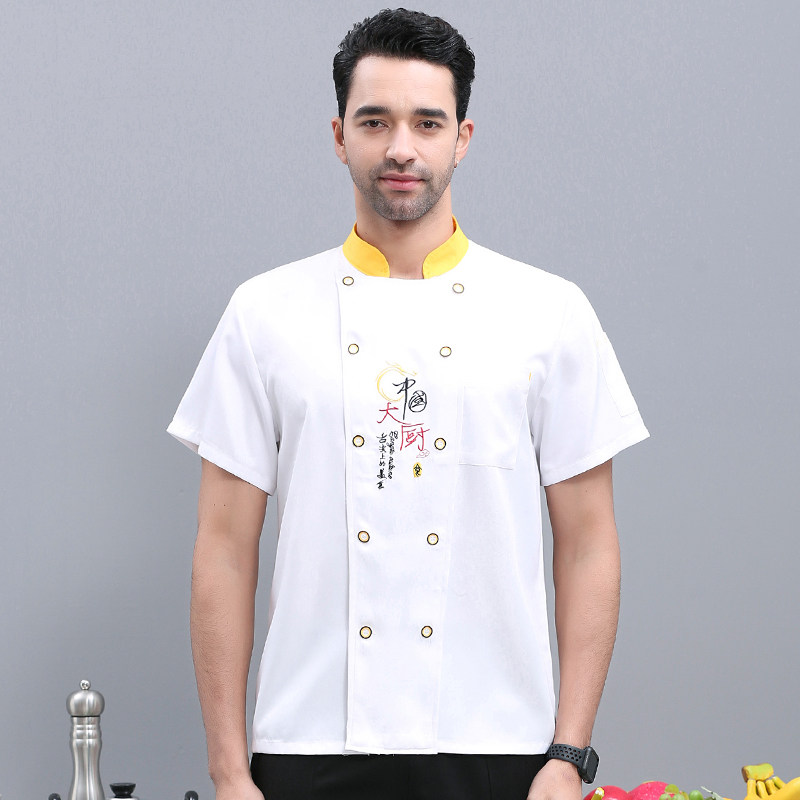 中国大厨风厨师工作服短袖薄款透气夏天黄领餐厅饭店厨房厨师服男