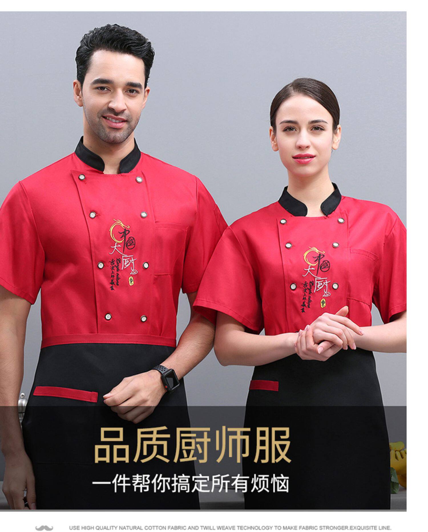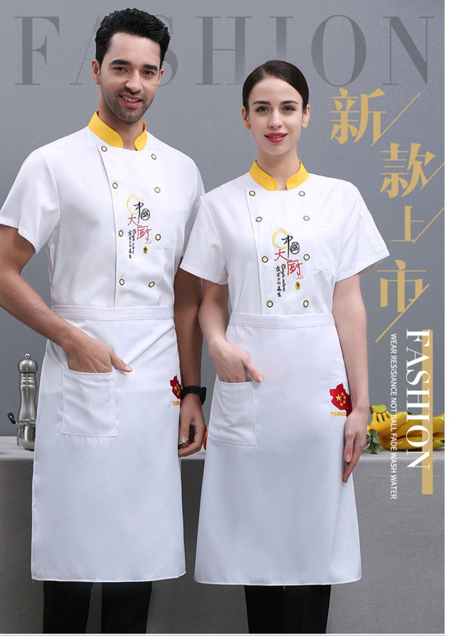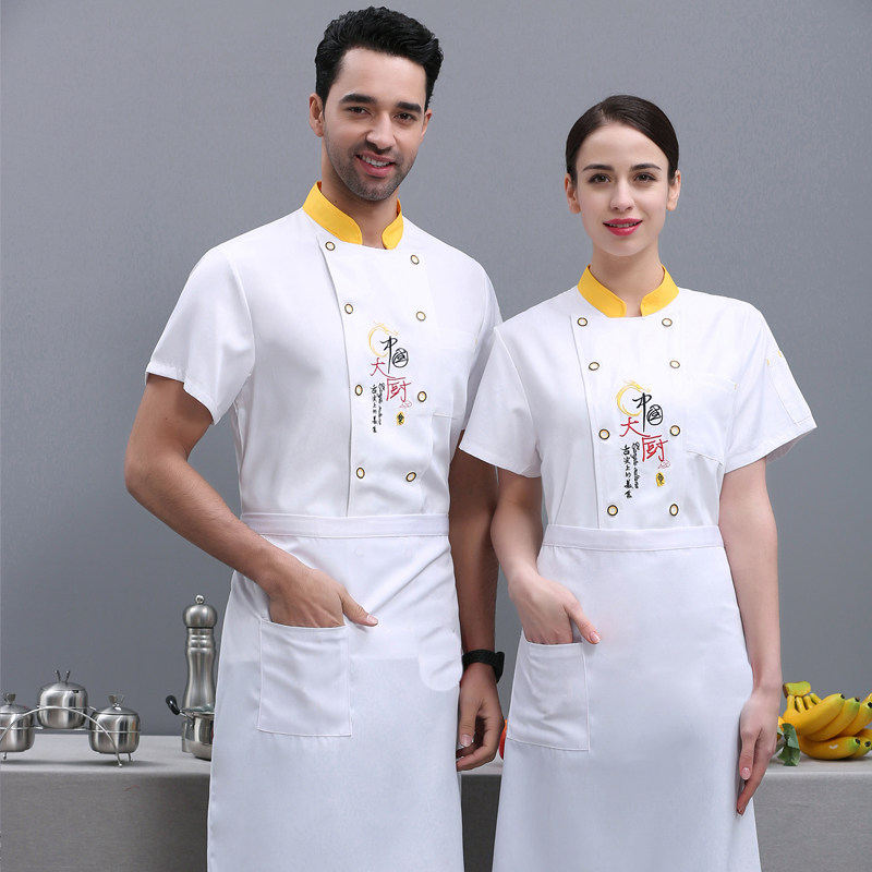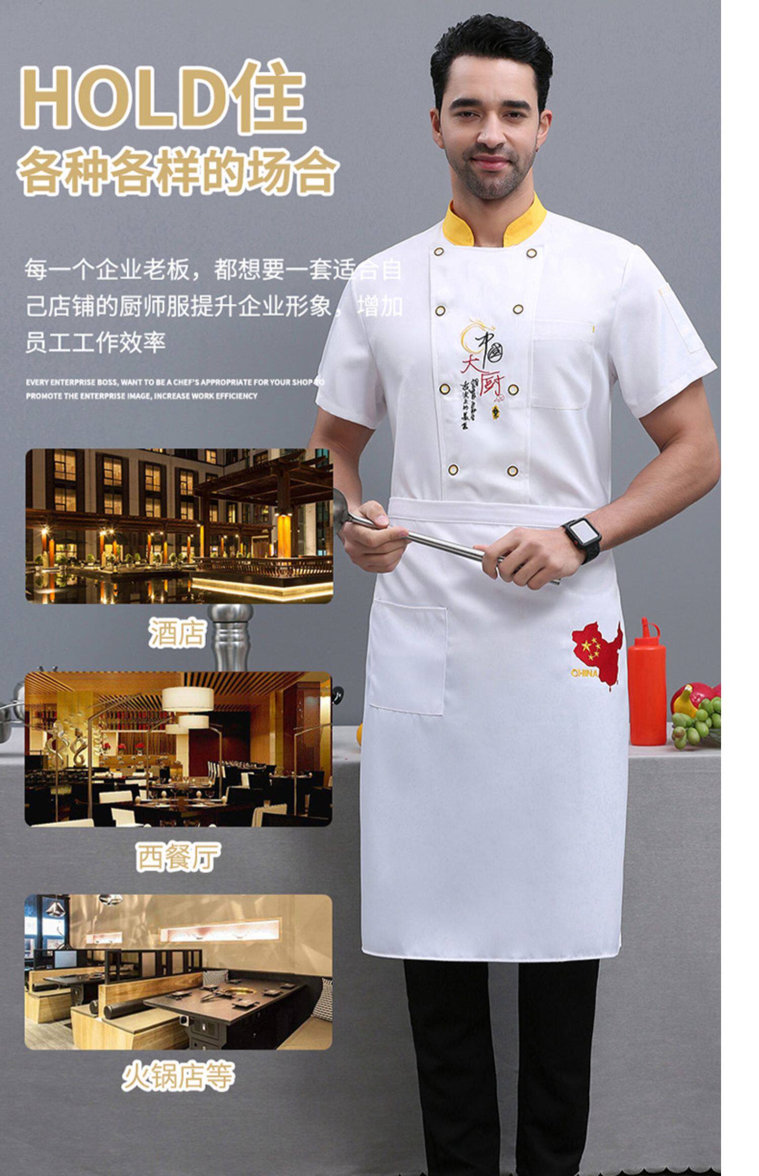 中国大厨风厨师工作服短袖薄款透气夏天黄领餐厅饭店厨房厨师服男
