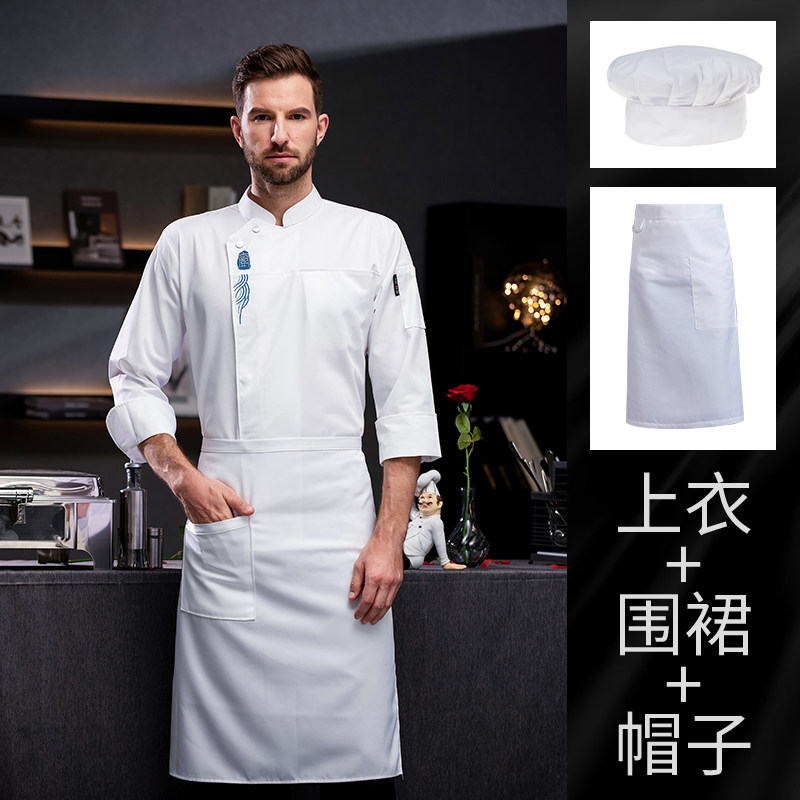 高端厨师工作服男白色长袖酒店西餐厅烘焙餐饮女厨房衣服套装定制
