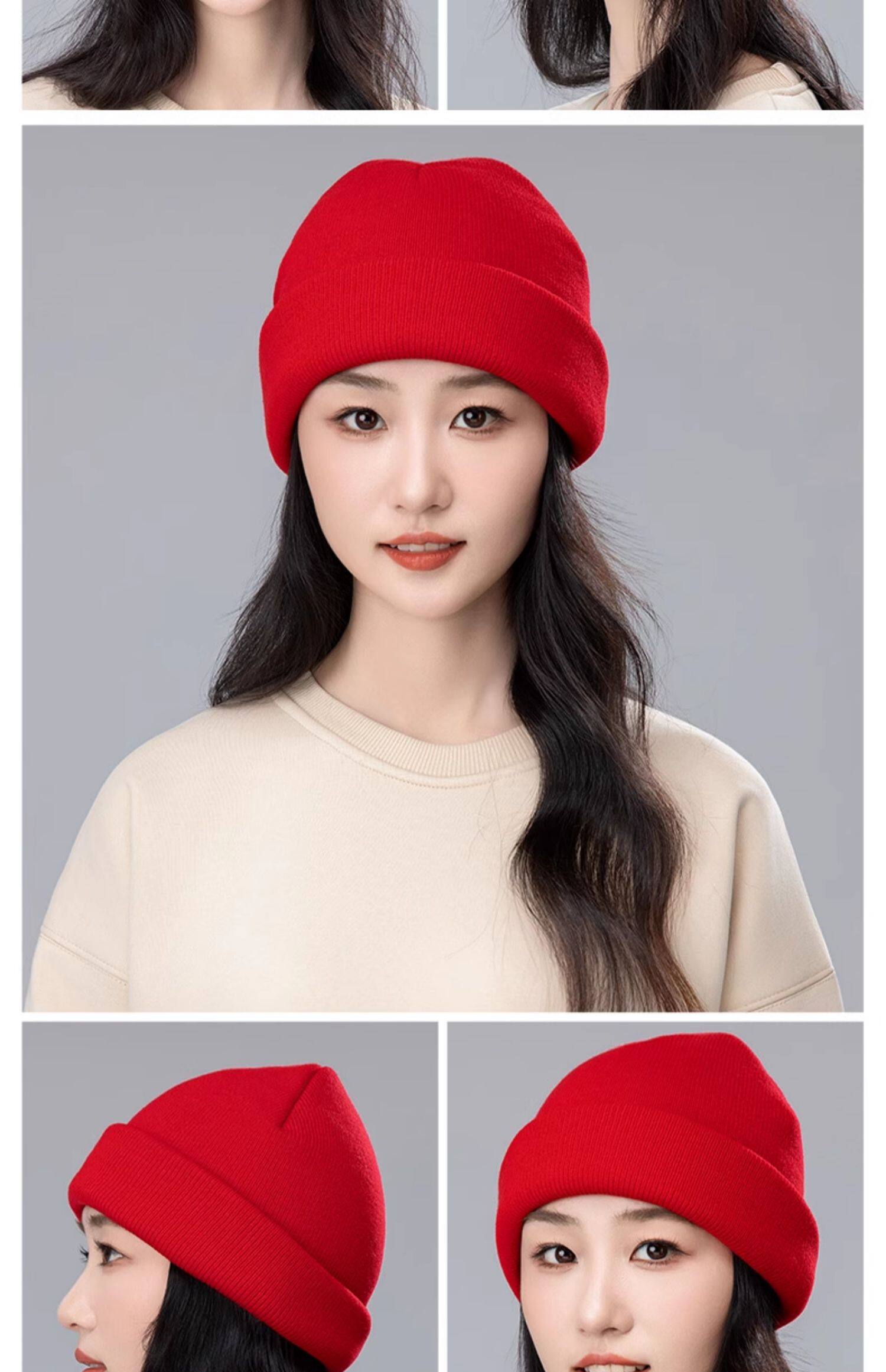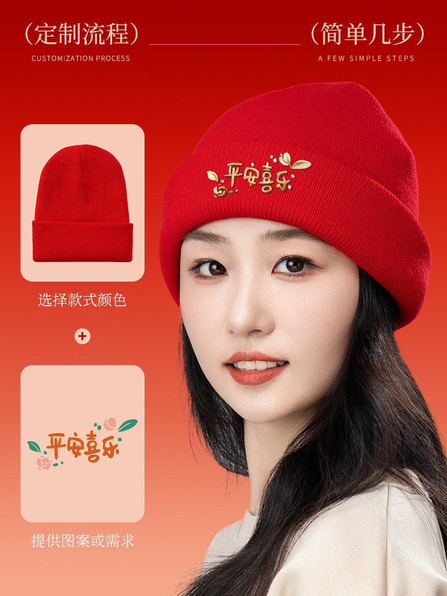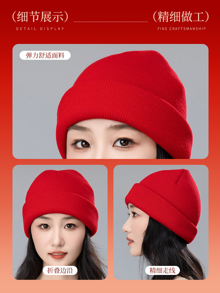 红色针织毛线帽定制logo刺绣冬季护耳保暖帽子新年聚会团队工作帽