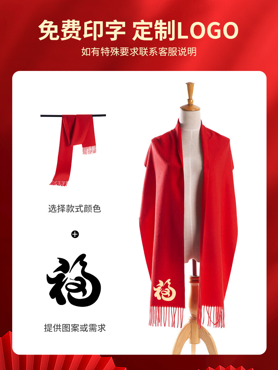 中国红围巾定制印logo图案刺绣企业年会商务会议公益演出围脖披肩